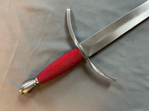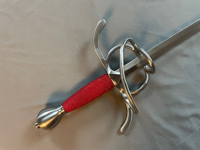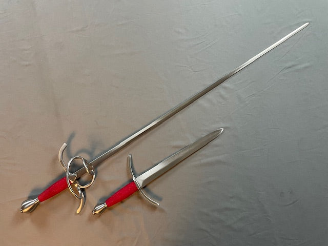 Rapier with steel schlager blade, opposing quillons, red rayskin grip, and ovoid pommel. Matching parrying dagger with 12" steel blade and curved guard .